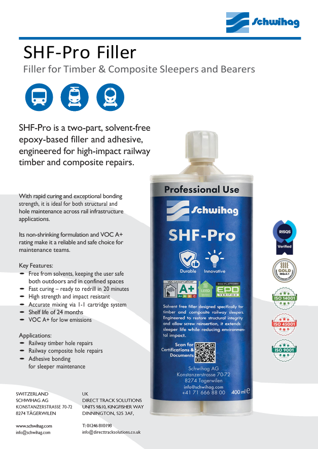 SHF-Pro is a two-part, solvent-free epoxy-based filler and adhesive, engineered for high-impact railway timber and composite repairs. With rapid curing and exceptional bonding strength, it is ideal for both structural and hole maintenance across rail infrastructure applications.